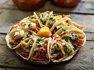 - Corn tortillas filled with marinated pork, pineapple, and fresh toppings.